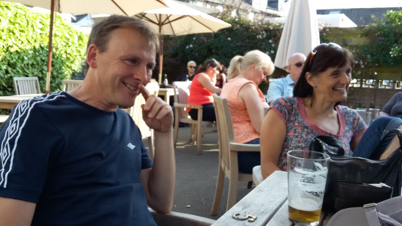 We stopped by the hotel, and sure enough, there was room. A lovely room too! With a back door where we could hang up our hand washing. Still a brilliant day out, so I got a pear cider from the bar at the hotel and sat out in the garden chatting with several folks. Two (Jonathan and Tim) were a gay couple from Manchester (I think). Jonathan was very swish and very loud (and not a little tipsy!). Tim was the quiet one of the pair. Both were sweet as they could be, but at some point, they both needed to pass out. I’ve never been able to keep up with the alcohol consumption of most of my English friends!